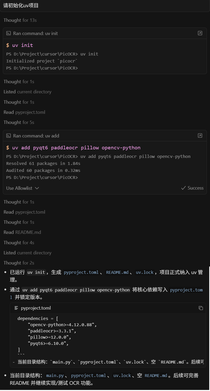- 通过 uv add pyqt6 paddleocr pillow opencv-python 将核心依赖写入 pyproject.toml 并锁定版本。