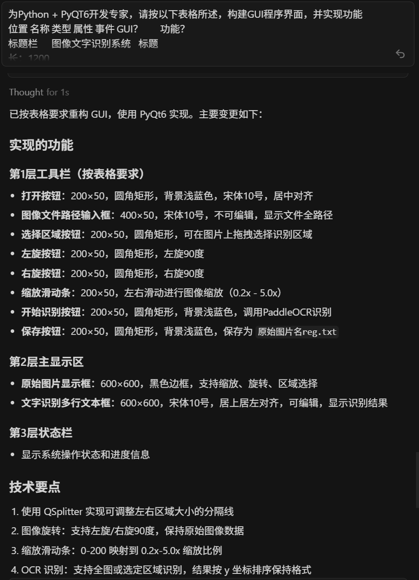 | - 系统名称:"图片文字识别系统" - GUI界面大小:默认大小1200*900 - GUI分为 3 部分:上部功能区、中间图片加载及文字显示区、底部状态显示区。 > 上部功能区(对象、属性、行为Action): 1) "选择图片" 圆角按钮(宽200,底色淡蓝) 点击"选择图片"后,显示图片文件选择框,可选图片类型: jpg, bmp, png 2) 图片文件路径文本框(宽200,不可编辑) 点击"选择图片"后,显示图片文件路径及文件名 3) "选择区域" 圆角按钮(宽150) 点击"选择区域"后,可在原始图片框中画出一个矩形框,用来设定要识别的图像大小,默认大小为整个图片 4) "缩放" 圆角按钮(宽150) 点击"缩放"后,可对原始图片进行放大或缩小操作 5) "开始识别" 圆角按钮(宽200,底色淡蓝) 点击"开始识别"后,调用paddle模块识别原始图像中所有文字,显示在图片文字识别显示区域;状态栏显示图片文字识别进度 6) "文字编辑" 圆角按钮(宽150) -- 暂不实现(直接可编辑) 点击"文字编辑"后,可对图片文字识别显示不区域的文字进行编辑 7) "保存格式" 下拉框(图片、Txt、图片&Txt) --- 暂不实现 选择识别文字的保存的格式:图片(识别文字显示在原始图片,格式与原始图片一致)、Txt(识别文字保存为Txt格式)-- 暂不实现 8) "保存文字" 圆角按钮(宽200,底色淡蓝) 点击"保存文字"后,将图片文字识别显示区域的文字保存在图片同一目录下,命名为 图片名-reg.txt > 中间图片显示区: 1)左侧,原始图片显示 区域(黑色边框,大小400*300) 2)中间,分隔线,可调整左右区域大小 3)右侧 图片文字识别显示 区域(黑色边框,大小400*300) > 底部状态栏:显示图片文字识别进度 及选中功能 -- 暂不实现 > 根据实际需要进行界面优化,代码优化 |