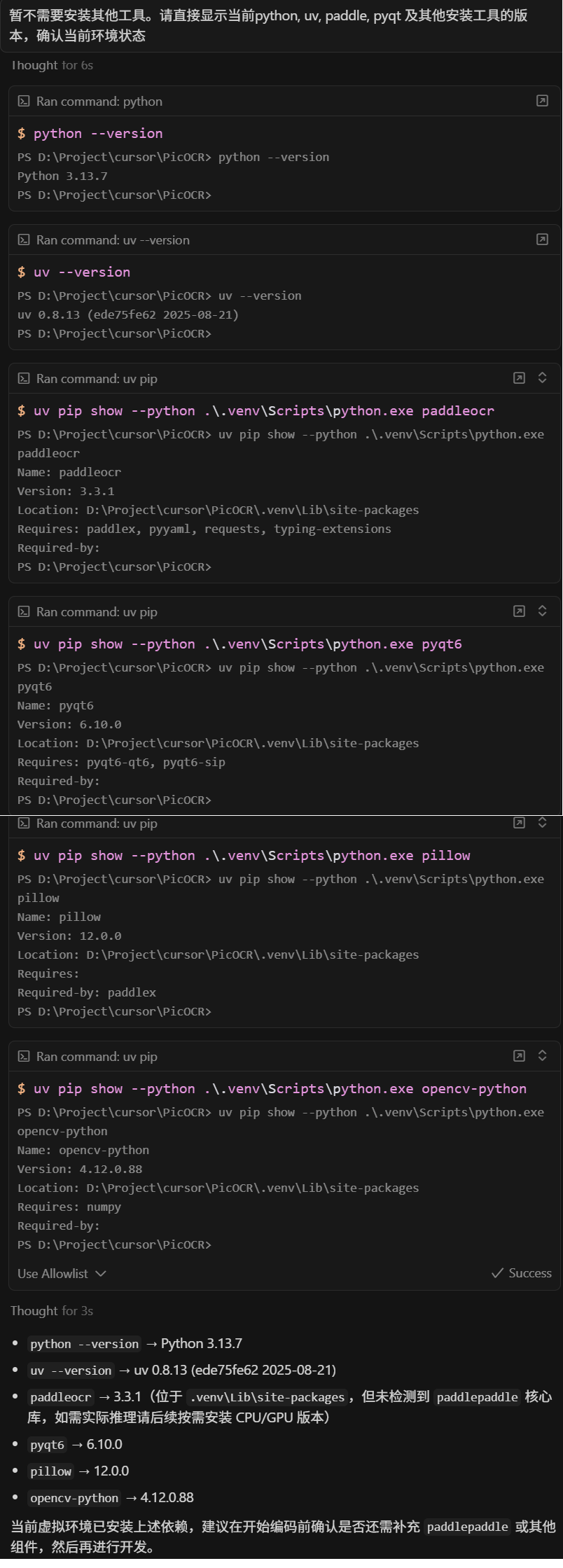 提问 3-5:暂不需要安装其他工具。请直接显示python, uv, paddle, pyqt 及其他安装工具的版本,确认当前环境状态