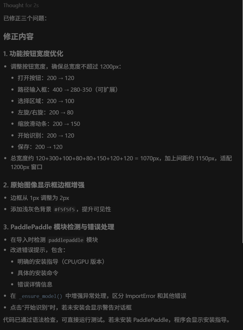 - 新增 ImageViewer 类支持橡皮筋选区、缩放(放大/缩小/重置)与默认全图识别区域;集成 PaddleOCR 识别流程并支持局部裁剪。