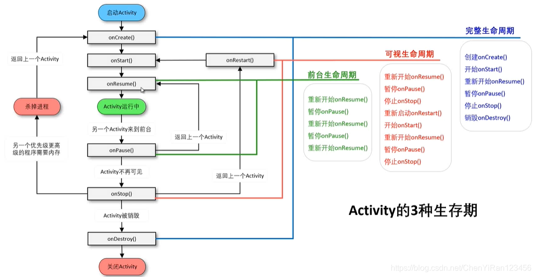 - 可视生命周期:活动在onStart()方法和onStop()方法之间所经历的,就是可视生命周期。在可视生命周期内,活动对于用户时可见的,但可能与用户无法交互。