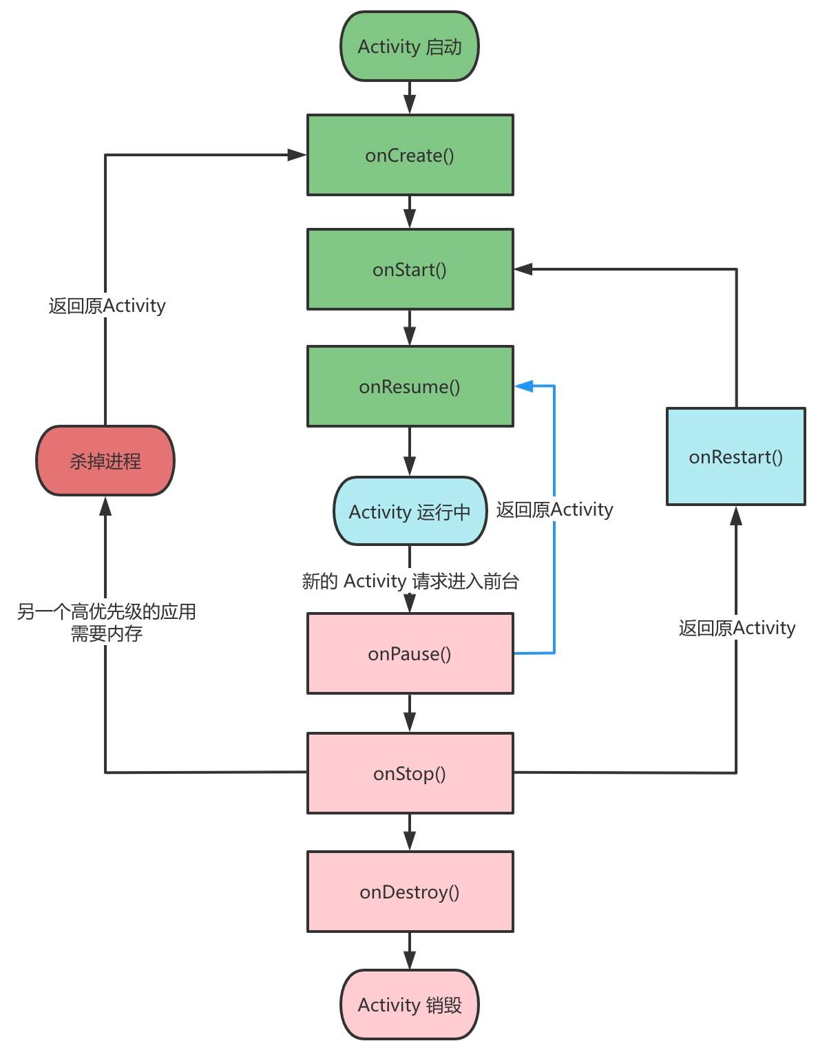 生命周期表现 :如果是后台Activity被杀,则此时没有任何生命周期回调,onDestory不会被调用。如果用户返回该Activity,如果此时进程还存活,系统会直接调用前台Activity的onRestart-> onStart-> onResume。如果进程已被系统杀死:系统会重新创建进程,并尝试重建任务栈顶的Activity(即用户上次看到的那个)。此时的生命周期与屏幕旋转类似: