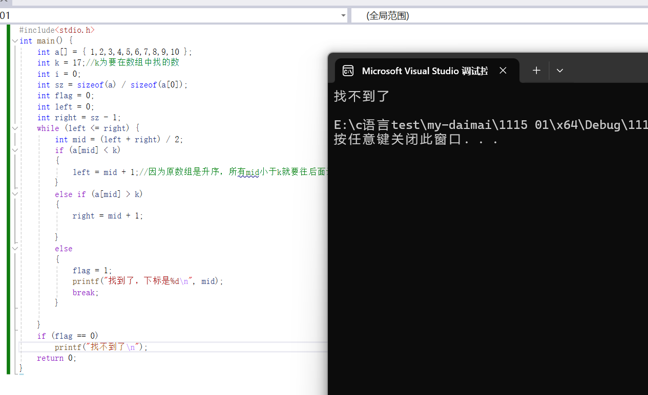 left = mid + 1;//因为原数组是升序,所有mid小于k就要往后面进行二分查找
