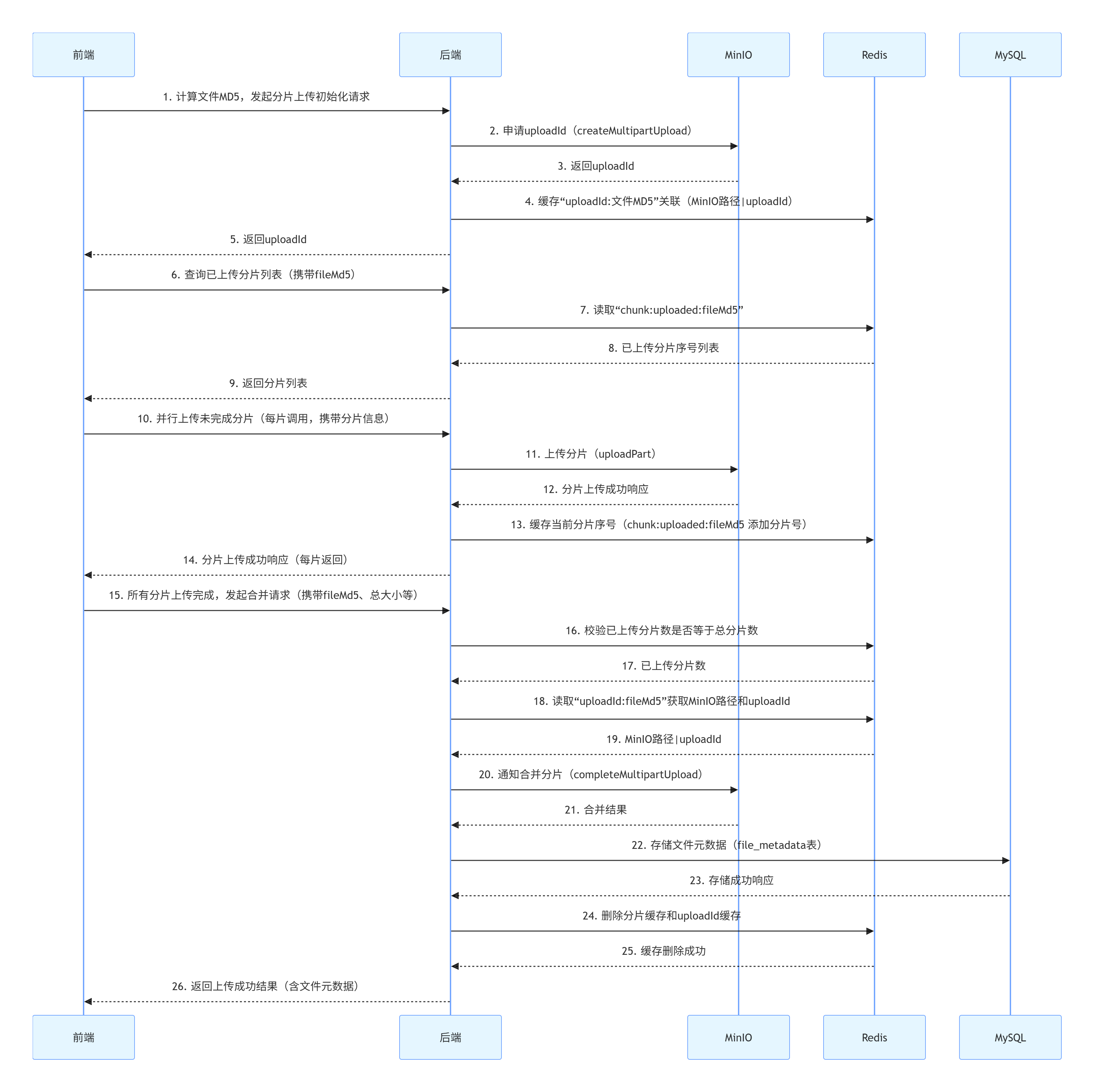 以下是分片上传从"初始化"到"最终完成"的26步连续时序图,清晰呈现前后端、Redis、MinIO、MySQL的全链路交互逻辑:
