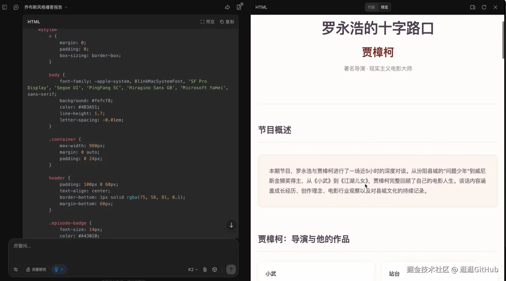它就会基于我之前的 UI 偏好,生成一个罗永浩访谈贾樟柯那一期的专题总结。