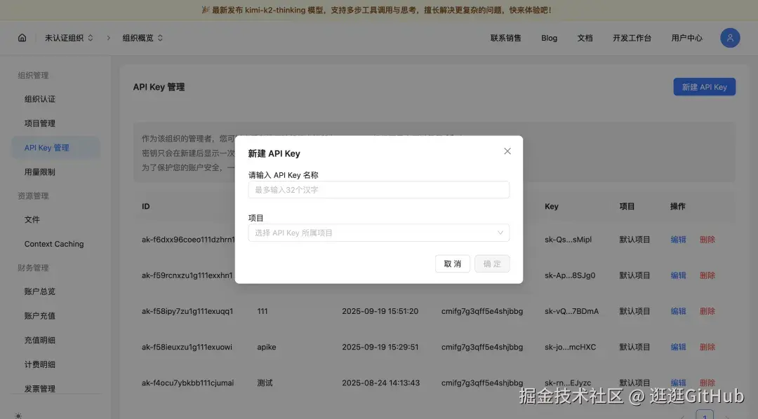 可以在 Claude Code 中接入 Kimi K2 Thinking。首先去月之暗面的 AI 开放平台获取 API Key。