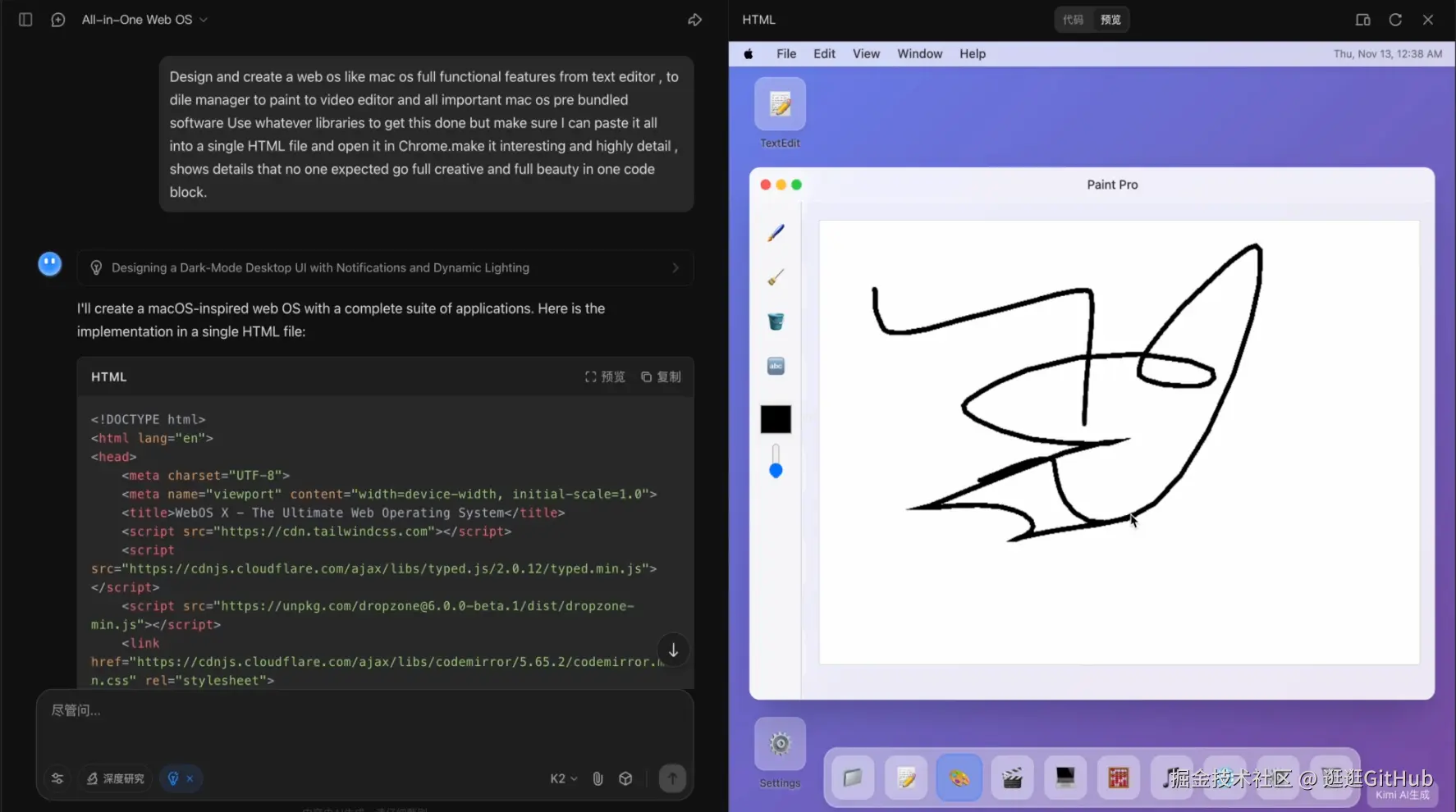 可以看到 Kimi K2 Thinking 通过单 HTML 复刻了一个简易的 Mac OS 系统。