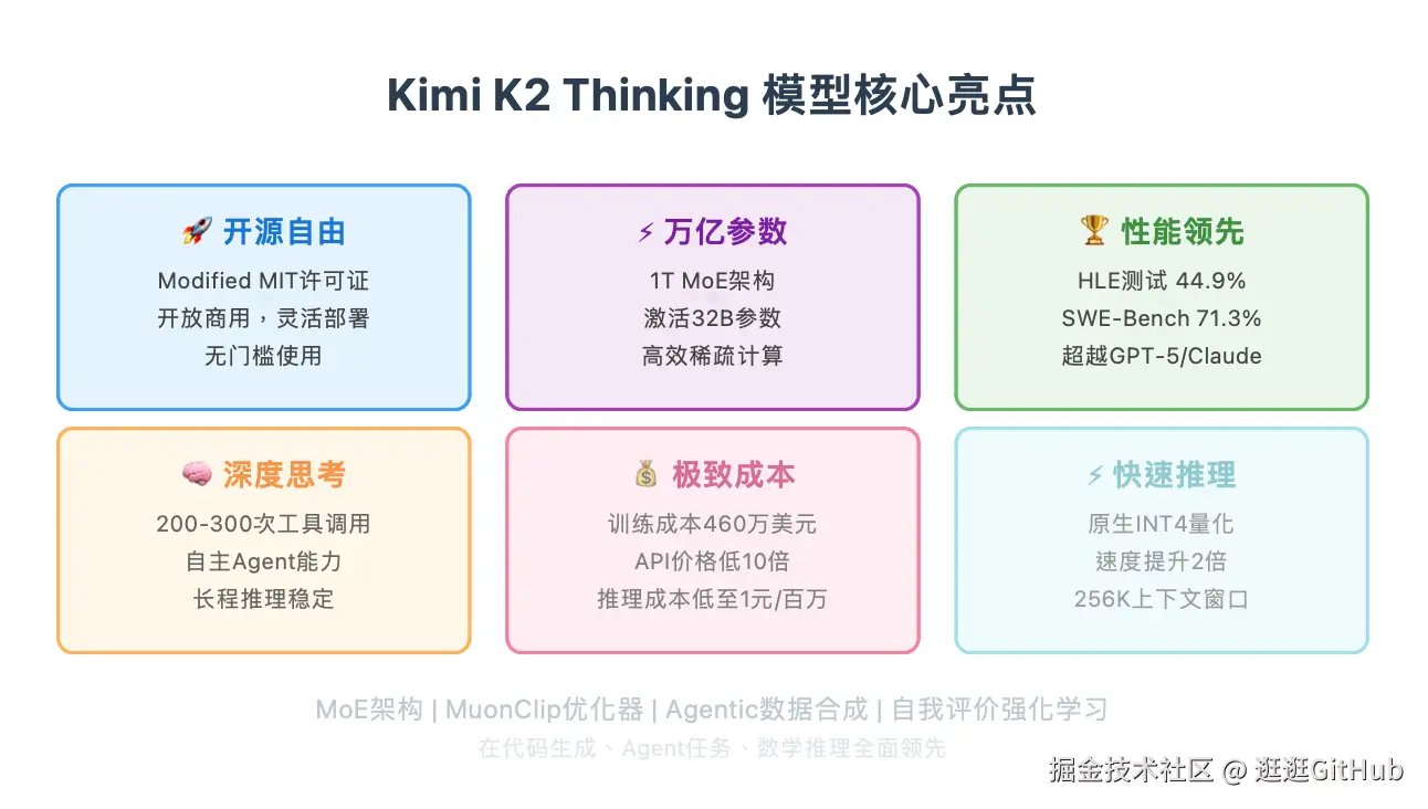 请搜索 kimi k2 thinking 开源模型的亮点。帮我生成一个网页:使用 svg 画出亮点总结。 网页有一个复制按钮,点击复制后我可以直接把 svg 可视化粘贴到公众号编辑器。