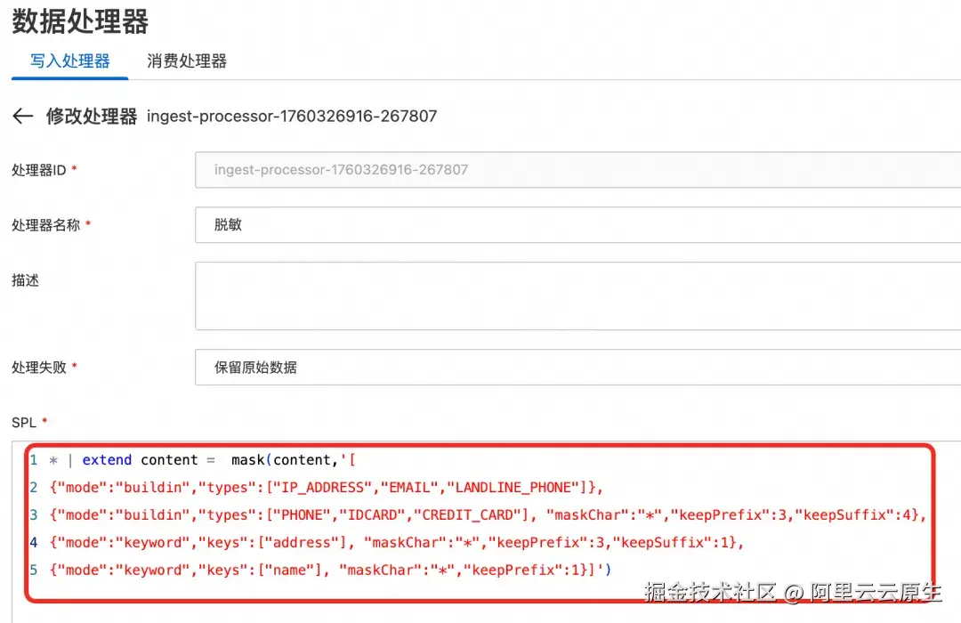 - 写入脱敏: 通过写入处理器配置 SPL 脱敏(mask)函数,确保敏感字段在入库时已被打码。