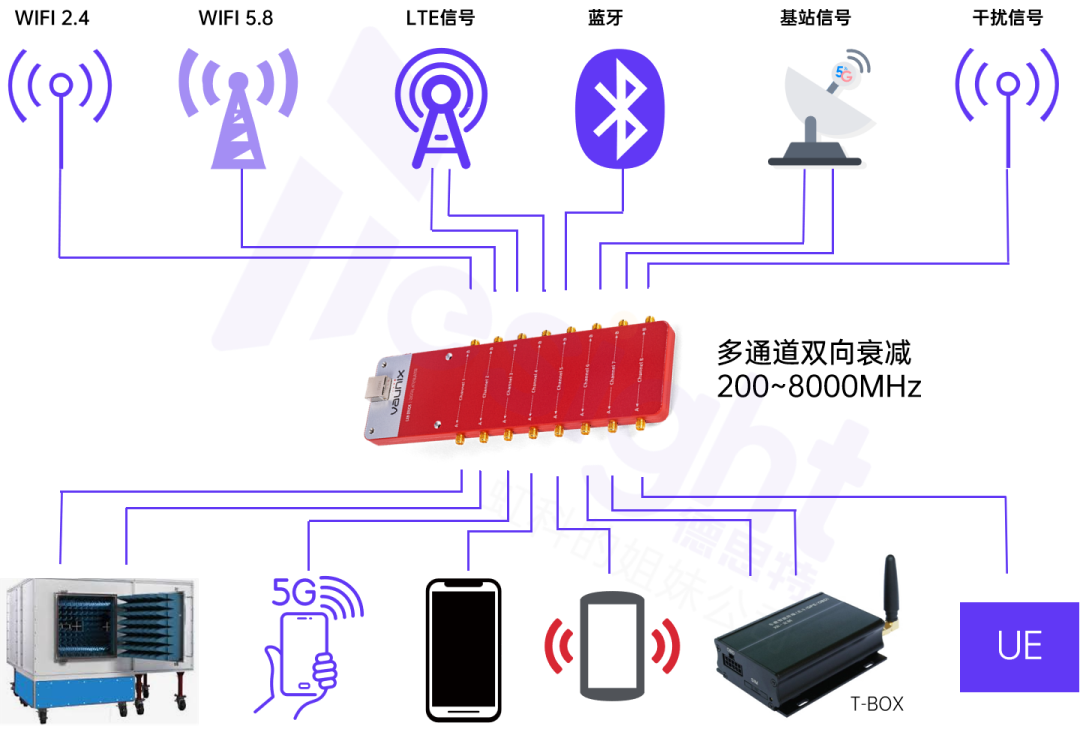 德思特Vaunix多通道衰减器最高可支持64通道同时测试,通过一台设备即可集中控制多链路或多设备衰减,有效降低了控制复杂度和成本,适合多天线、多端口设备、或多链路的测试。其典型应用场景可包括: