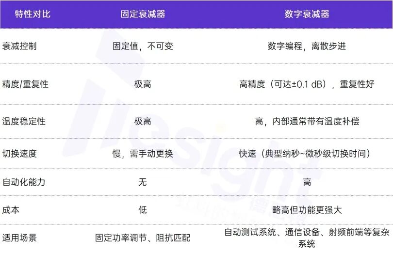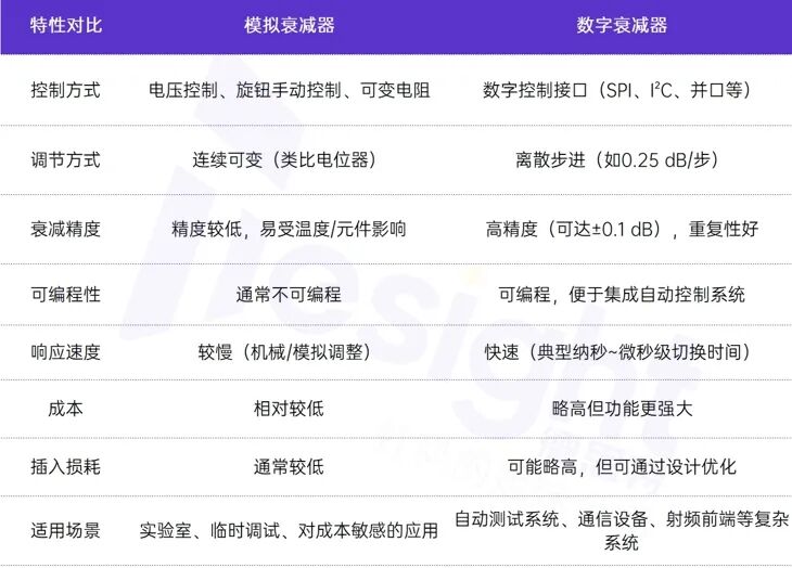 模拟衰减器 通常是通过连续的模拟信号来改变衰减值,多采用PIN二极管、可变电阻、或机械结构(手动旋钮等)实现,其衰减量通常是连续可调,可以实现快速、平滑的功率控制。然而,其控制精度较低,不容易达到0.5dB量级,且衰减量通常受控制电压或温度的影响较大,需要复杂的校准和查表补偿才能获得较高的精度。此外,由于模拟电路的漂移特性,其重复性通常不如数字器件,故一致性和可重复性差。