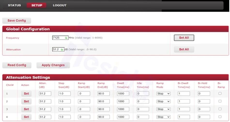 使用者可采用德思特自研的控制软件,该软件的Status界面可将硬件的相关信息以及状态同步显示,Setup界面则可通过Set All一键完成所有通道的参数设定,也可根据实际需求逐一改变通道频率和衰减值的设置。操作简单,功能多样。