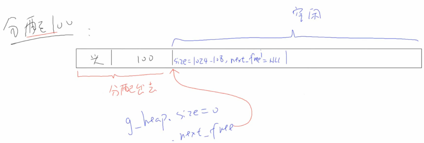 g_heap.next_free找到空闲块(大小 1024 字节); - 从该块中拆分出 "头部(8 字节,假设 int 和指针各 4 字节)+100 字节用户数据",共 108 字节;