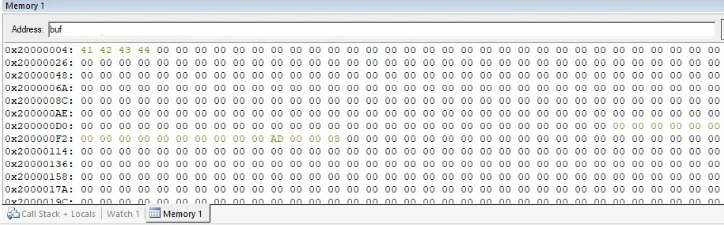 heap_buf的首地址为 0x20000004,分配的 100 字节从该地址开始,前 26 字节依次存入 'A'~'Z',与代码逻辑完全匹配;