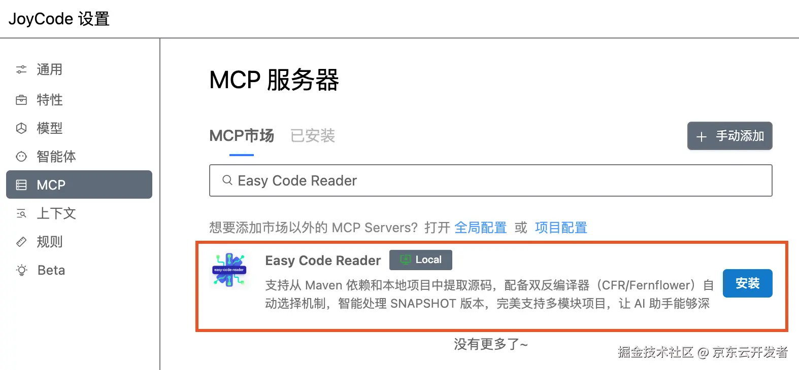 参考以下在 Joycode 中的 MCP 客户端配置,搜索 "Easy Code Reader",点击安装: