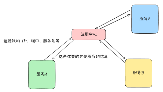 当服务 A需要调用服务B时,会向注册中心查询服务 B的所有可用实例(IP+端口),然后从这些实例中选一个(如轮询、随机)发起请求。