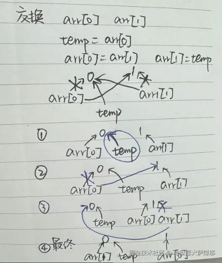 传统的元素交换方式就是创建一个temp变量 交换本质上不会改变值 只会改变空间的指向 值可以被多个空间指向