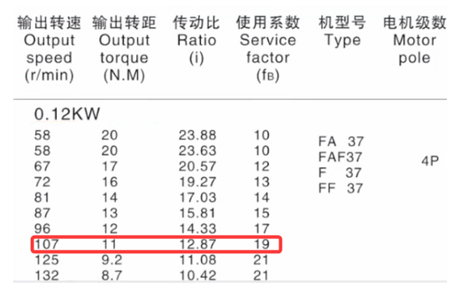 根据表格中的型号选择输出功率为0.12KW,输出转速107rpm,输出转矩11Nm的减速电机