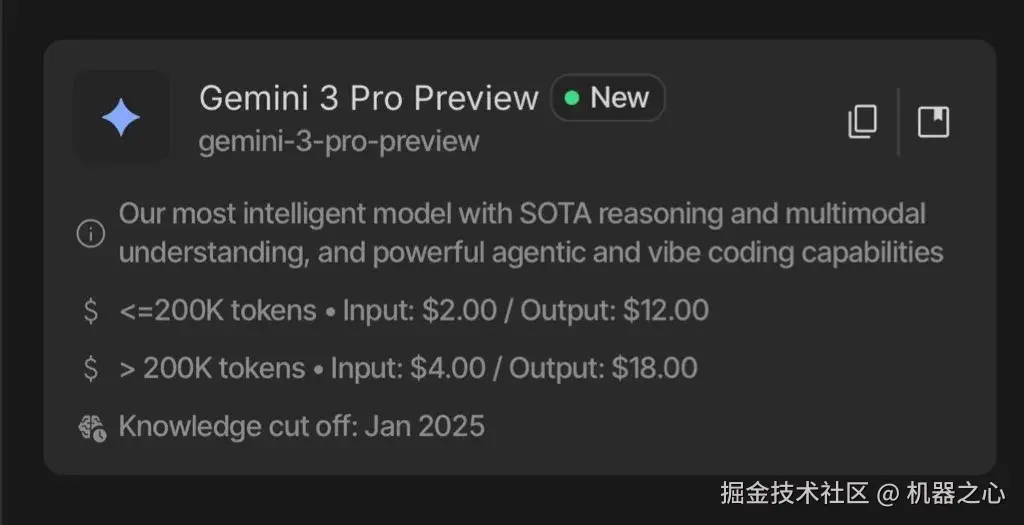 定价方面,Gemini 3.0 Pro 引入了基于上下文长度的分级定价机制:200k tokens 以下的任务,输入 / 输出价格为 <math xmlns="http://www.w3.org/1998/Math/MathML"> 2.00 / 2.00/ </math>2.00/12.00(每百万 token);超过 200k tokens 则分别为 <math xmlns="http://www.w3.org/1998/Math/MathML"> 4.00 和 4.00 和 </math>4.00和18.00。