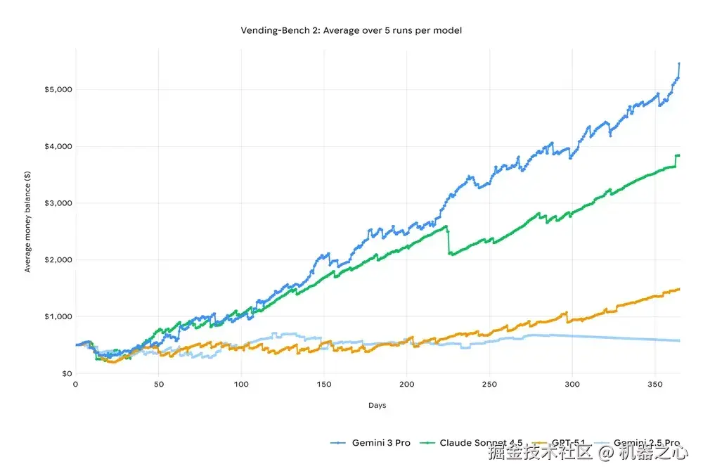 Gemini 3 的规划能力在 Vending-Bench 2 测试中进一步得到印证:Gemini 3 在模拟售货机经营测试中登顶该排行榜,全程通过长周期规划管理虚拟商业运营。