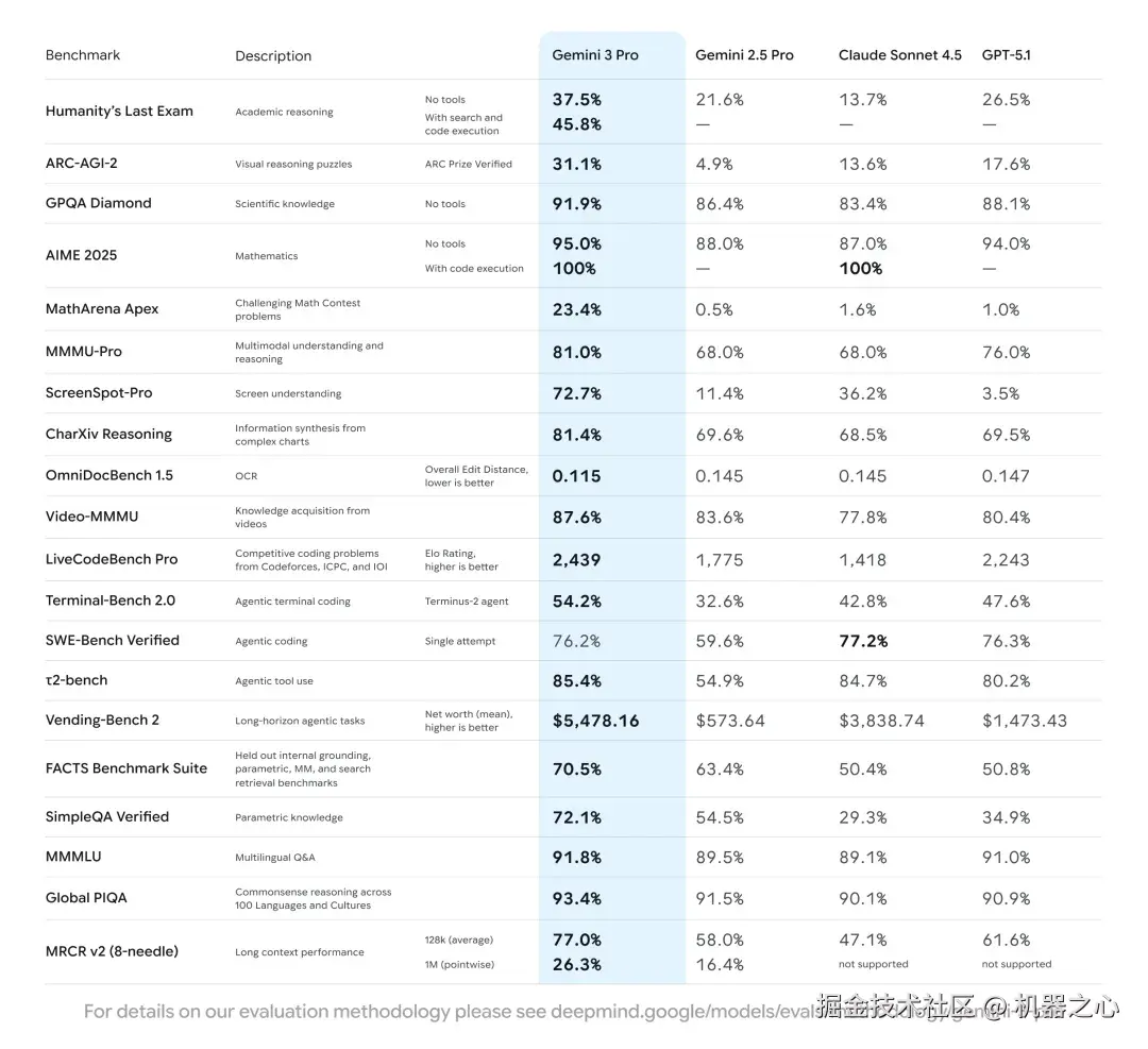 Gemini 3 Pro 被官方称为「最先进的推理模型」,在几乎所有主流 AI 基准测试中均显著超越了前代 Gemini 2.5 Pro,并且全面压制了 Claude Sonnet 4.5 和 GPT-5.1 等主要竞品。
