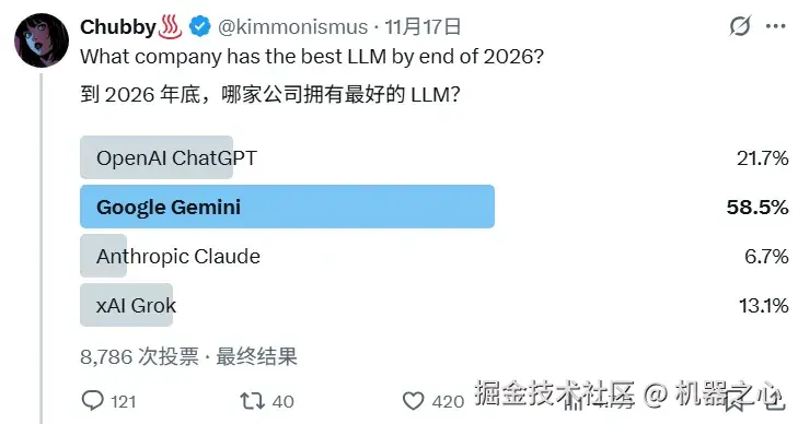 在 X 博主 Chubby 发起的「到 2026 年底,哪家公司拥有最好的 LLM?」投票中,Google Gemini 遥遥领先。
