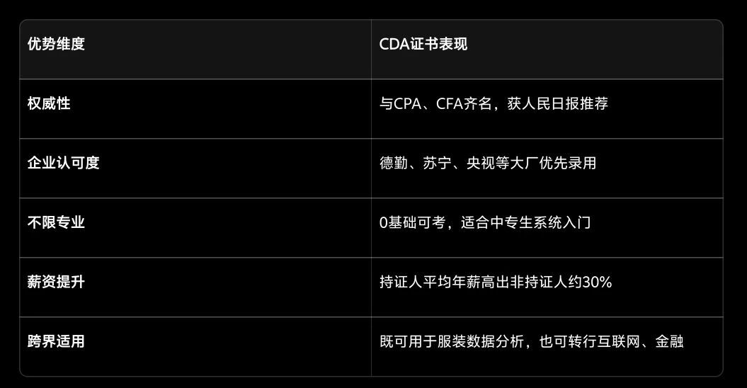 在时尚产业与数字科技深度融合的今天,服装设计早已不是"画图+缝纫"的传统手艺。对于中专学历的学生来说,入行门槛虽低,但想在激烈竞争中脱颖而出,必须掌握"设计+数据"的双重能力。而CDA数据分析师证书,正是帮助你打破学历局限、实现职业跃迁的关键跳板------它不仅能让你读懂市场,更能用数据驱动设计,成为企业争抢的复合型人才。📊
