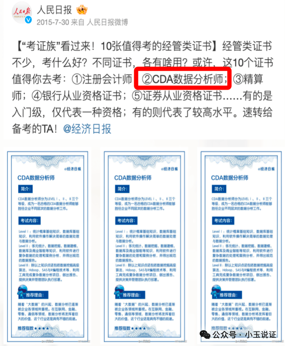CDA数据分析师是数据领域认可度最高的证书,与CPA注会、CFA特许金融师齐名。受到了人民日报、经济日报等权威媒体推荐。