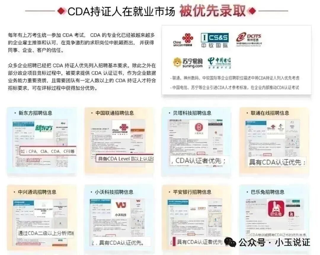CDA企业认可度非常高,很多企业招聘时注明CDA数据分析师优先,对找工作非常有帮助。很多银行、金融机构的技术岗会要求必须是CDA数据分析师二级以上的持证人。中国联通、央视广信、德勤、苏宁等企业,把CDA持证人列入优先考虑或者对员工的CDA考试给补贴。