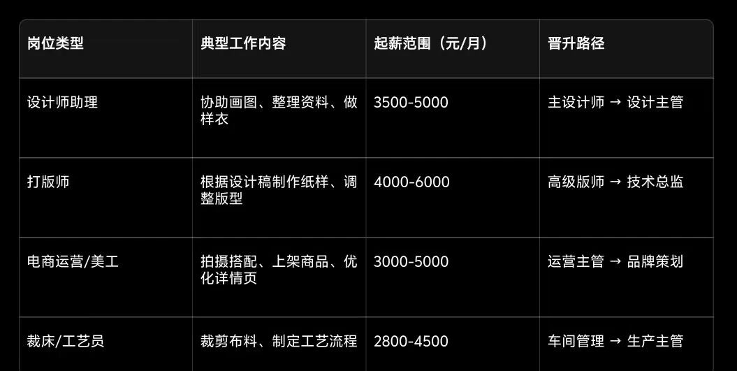 很多人认为"学服装设计=好找工作",但现实是:基础岗位饱和,高端岗位门槛高。中专毕业生通常从设计师助理、打版师、样衣工、电商美工等岗位入行,起薪普遍在3500-5500元之间。