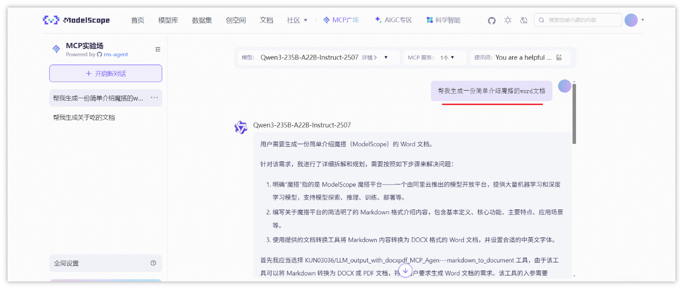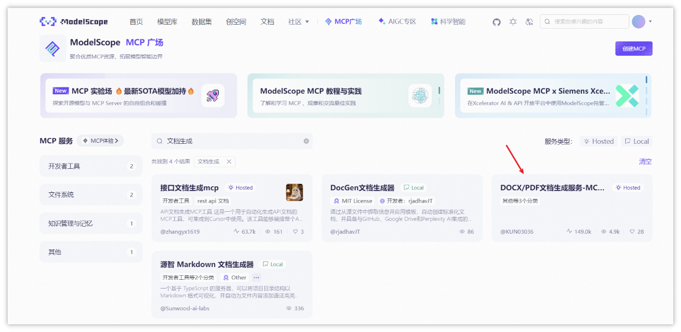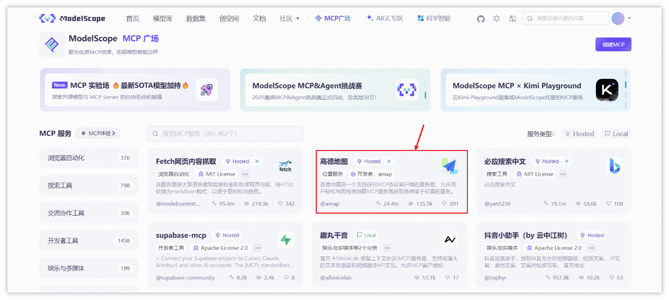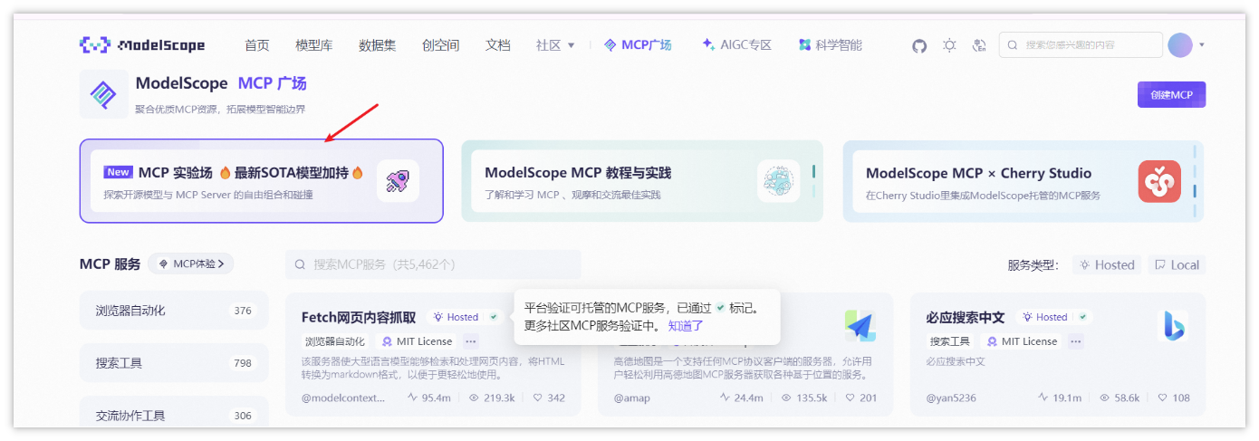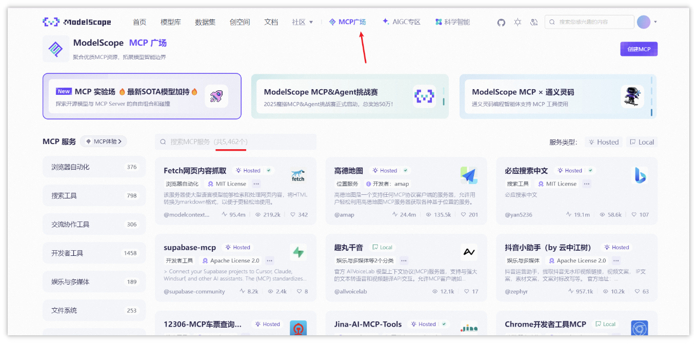 我们以魔搭举例来说明MCP的使用,打开魔搭中的MCP广场:https://www.modelscope.cn/home