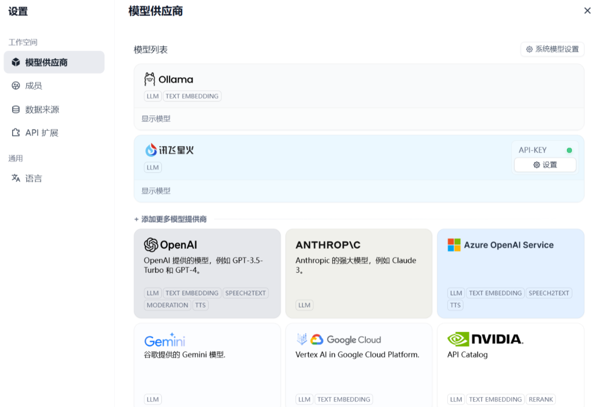 - 系统推理模型 :在创建的应用中,用的是该类型的模型。智聊、对话名称生成、下一步问题建议用的也是推理模型。已支持的系统推理模型供应商:OpenAI、Azure OpenAI Service、Anthropic、Hugging Face Hub、Replicate、Xinference、OpenLLM、讯飞星火、文心一言、通义千问、Minimax、ZHIPU(ChatGLM)