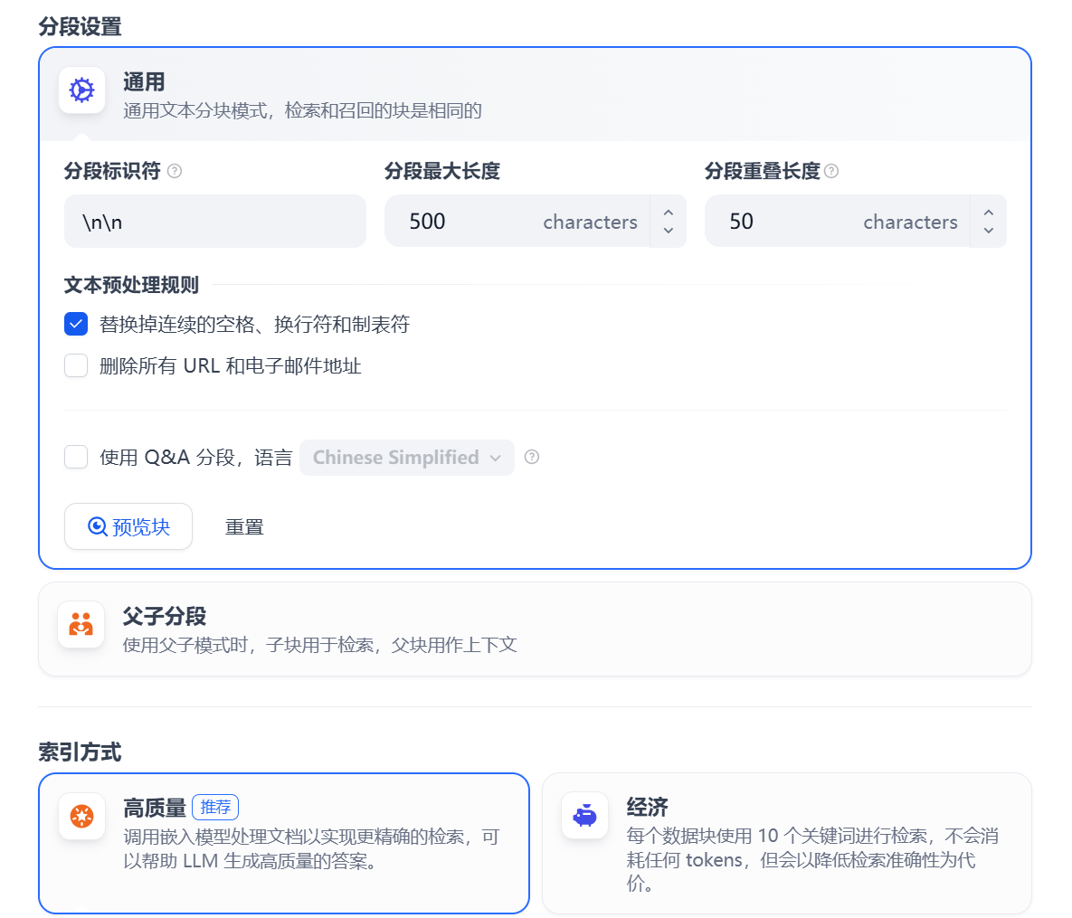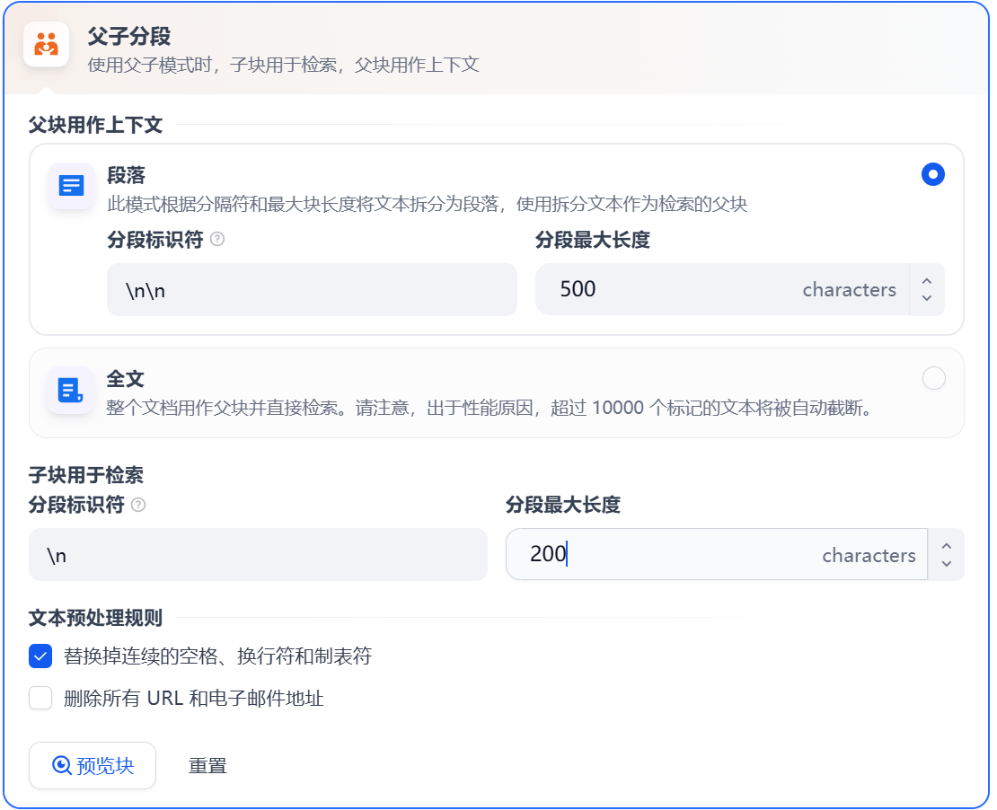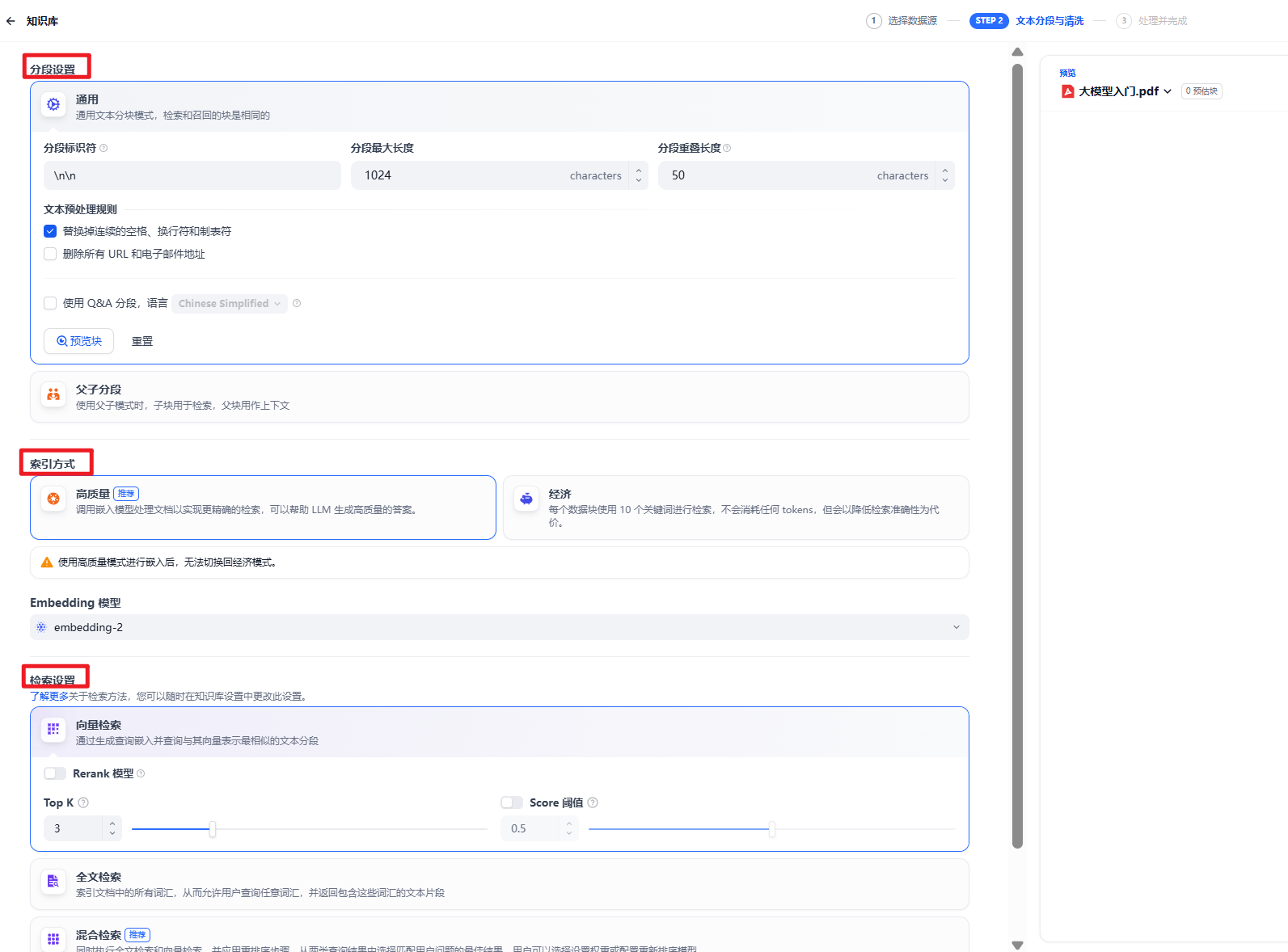 - 指定分段模式。该阶段是内容的预处理与数据结构化过程,长文本将会被划分为多个内容分段。你可以在此环节预览文本的分段效果。