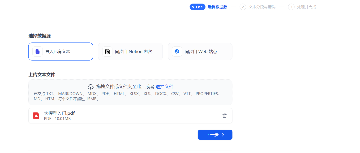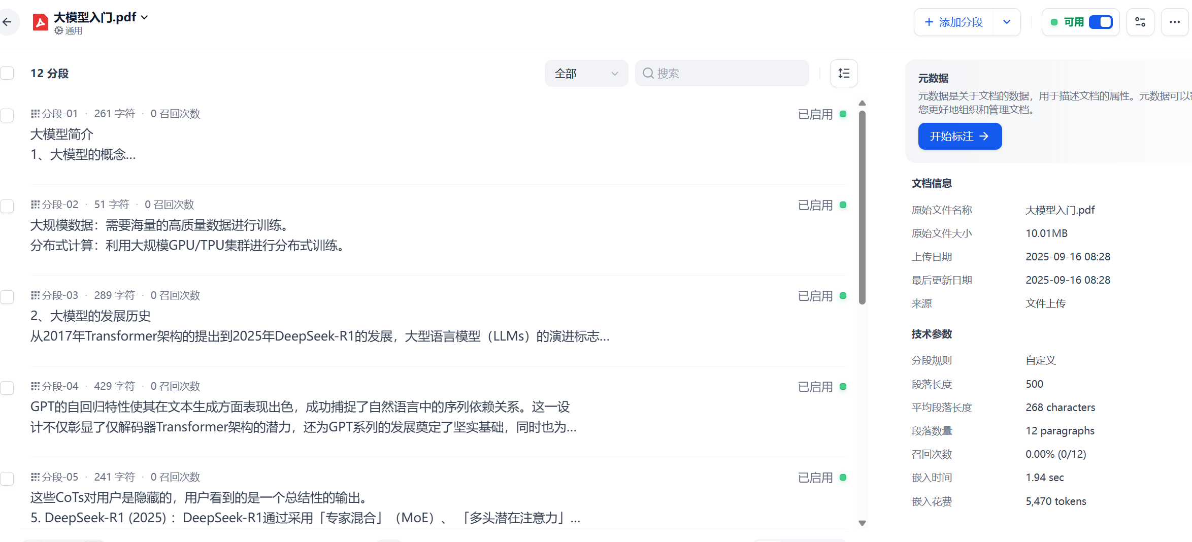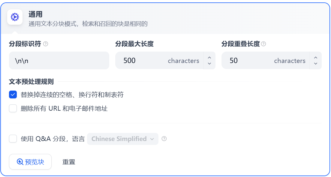 - 指定分段模式。该阶段是内容的预处理与数据结构化过程,长文本将会被划分为多个内容分段。你可以在此环节预览文本的分段效果。