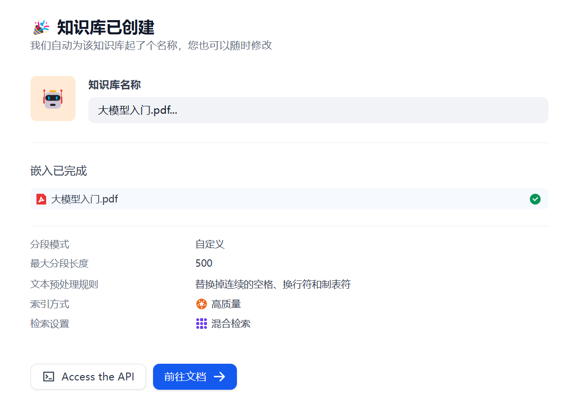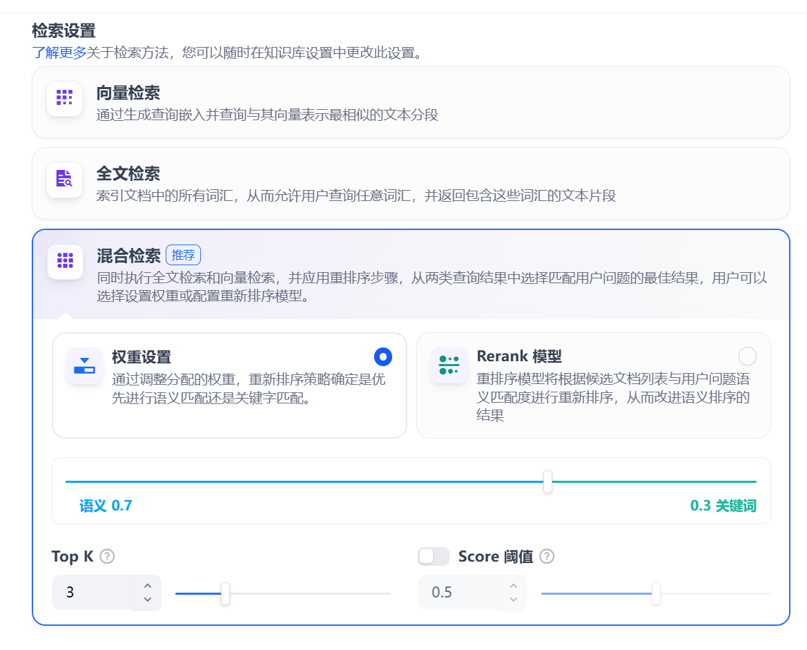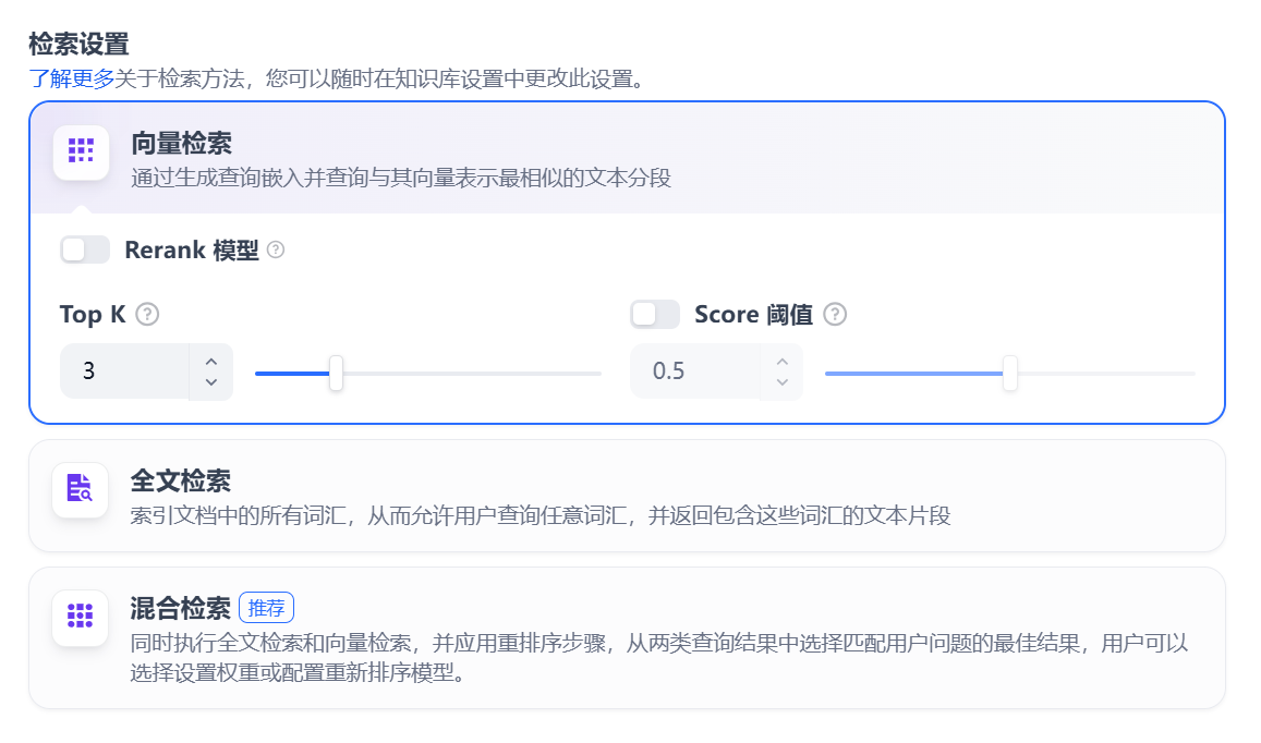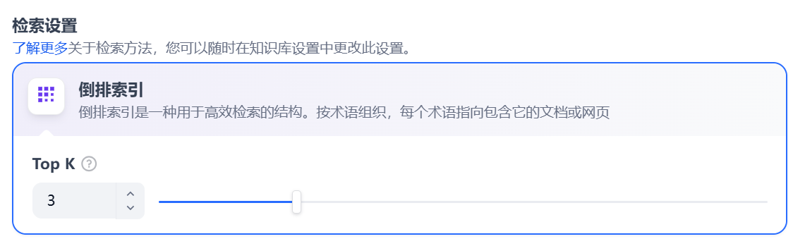 - 设定索引方法和检索设置。知识库在接收到用户查询问题后,按照预设的检索方式在已有的文档内查找相关内容,提取出高度相关的信息片段供语言模型生成高质量答案。