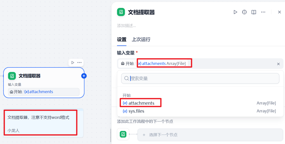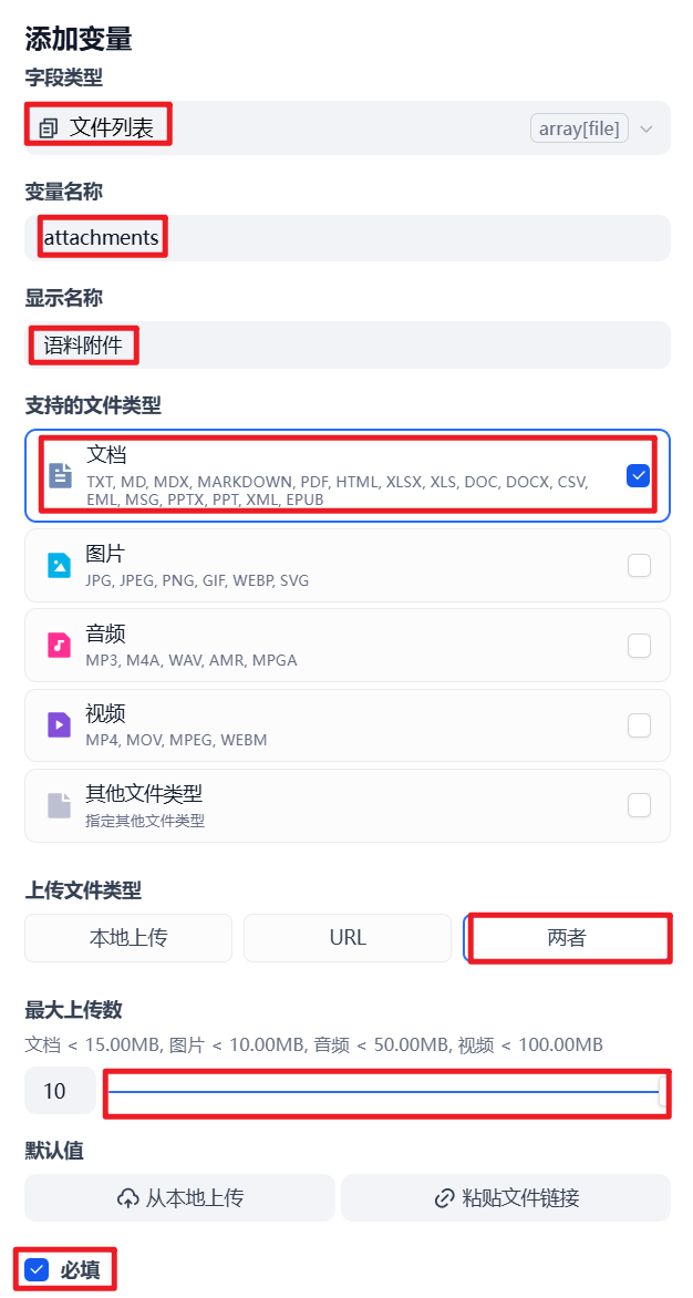 - attachments:支持本地/远程URL上传文档文件(限制10MB)