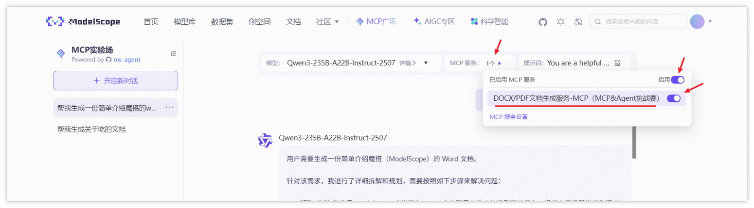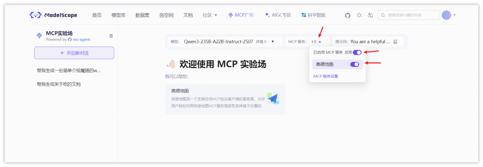 打开MCP 实验场,可以测试我们开通的MCP 服务