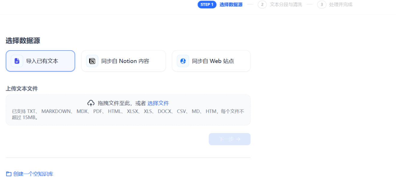 - 创建知识库。通过上传本地文件、导入在线数据或创建一个空的知识库。