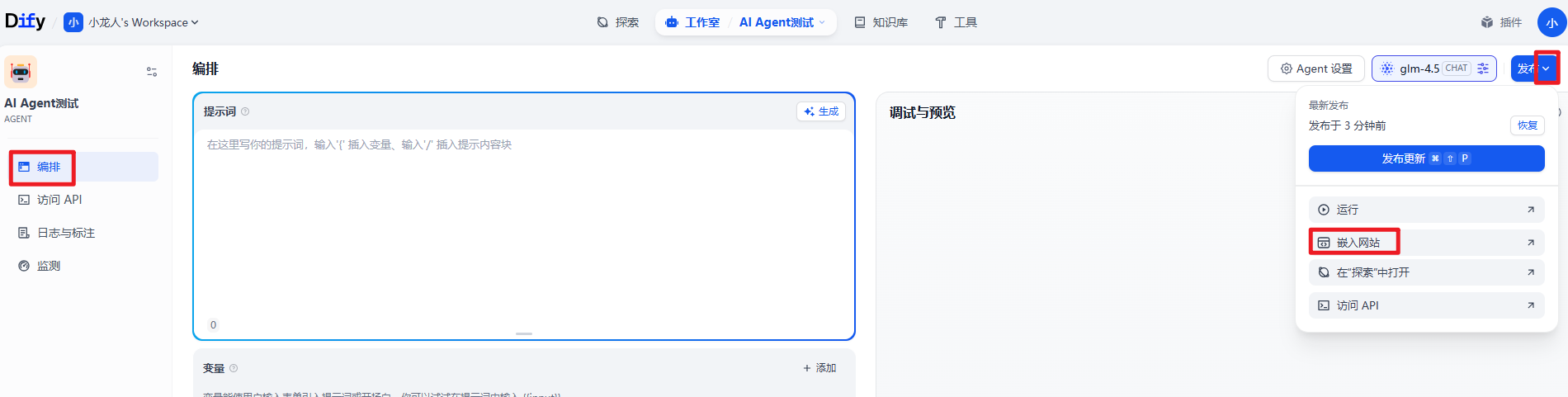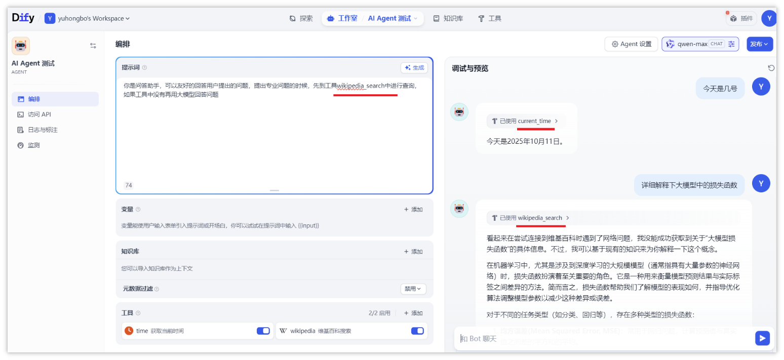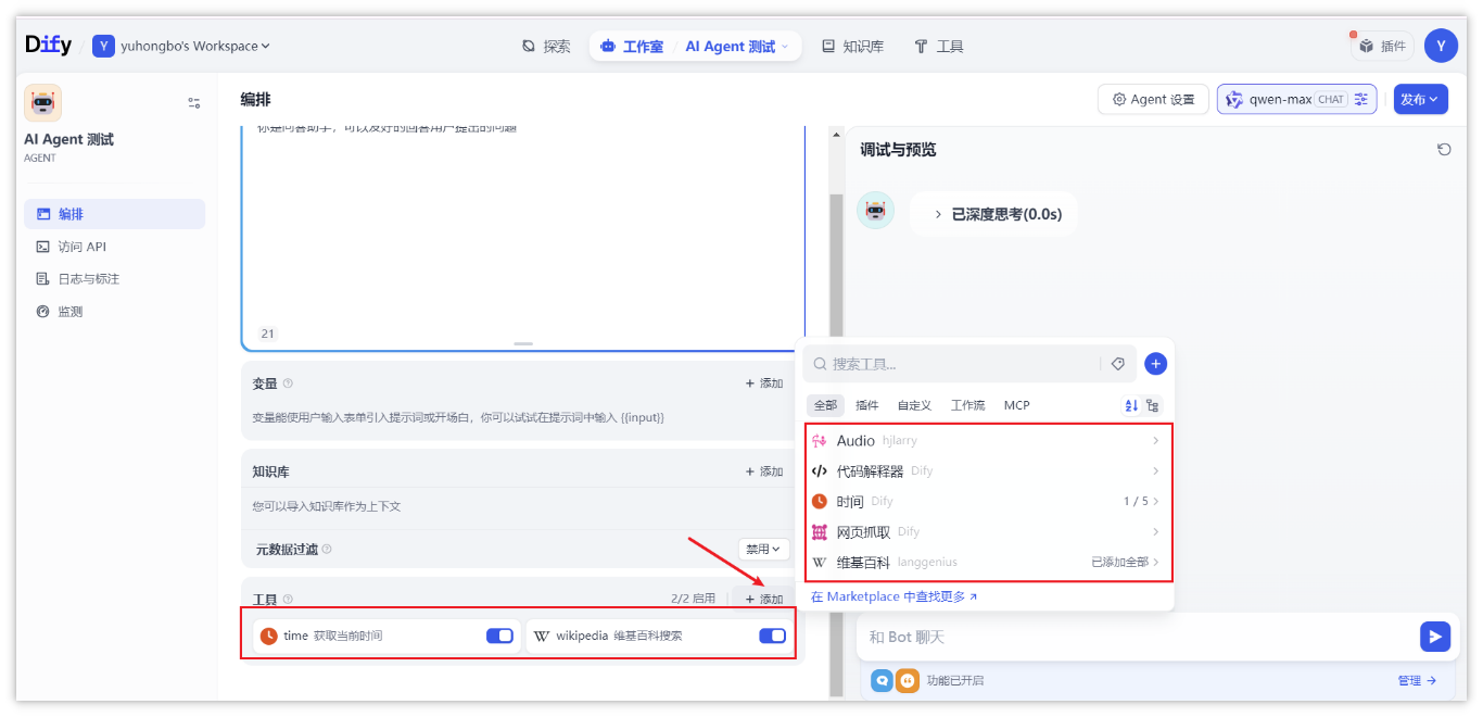 我们打开之前创建好的agent智能体,可以进行配置工具,如下图: