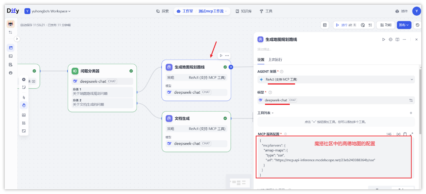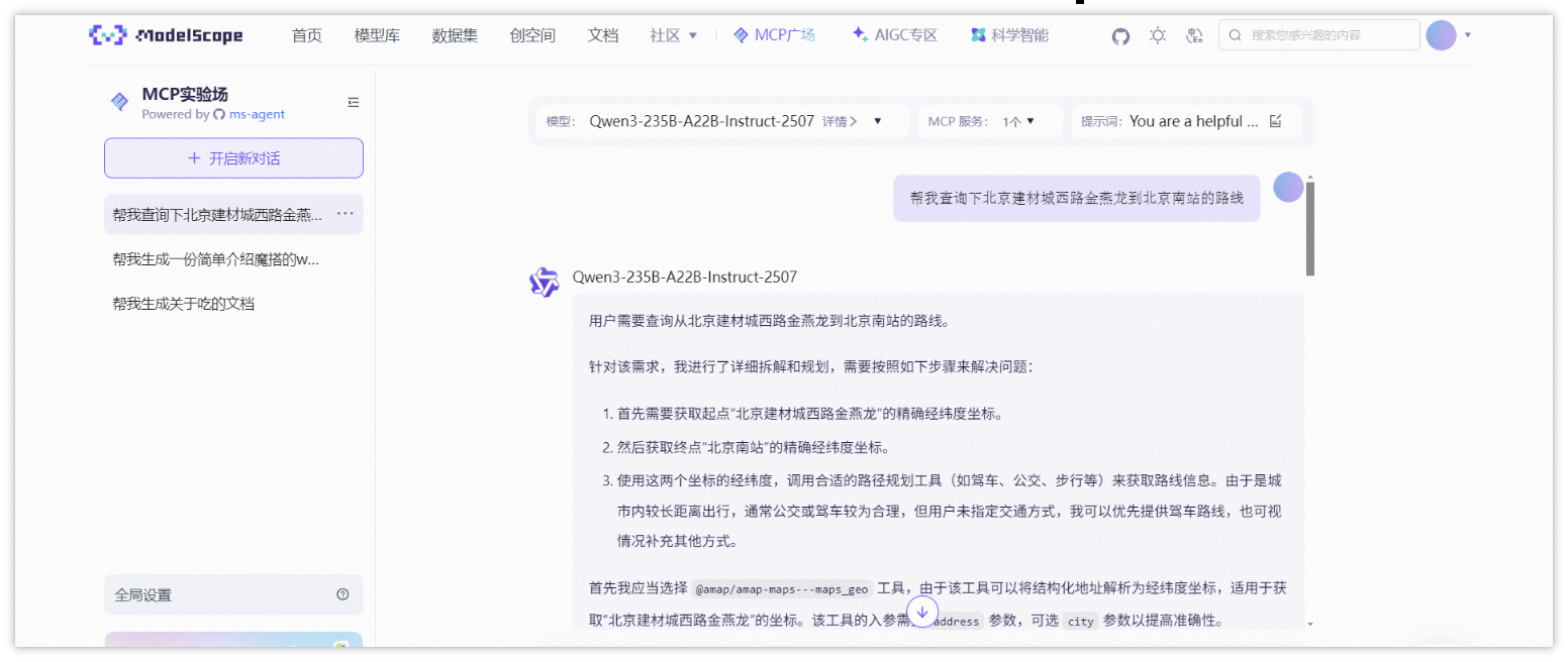 测试功能:可以随便让地图做一个路线规划,可以发现使用了高德地图的mcp服务