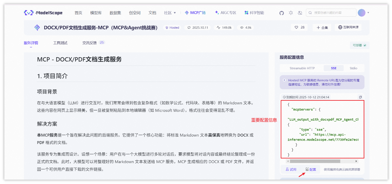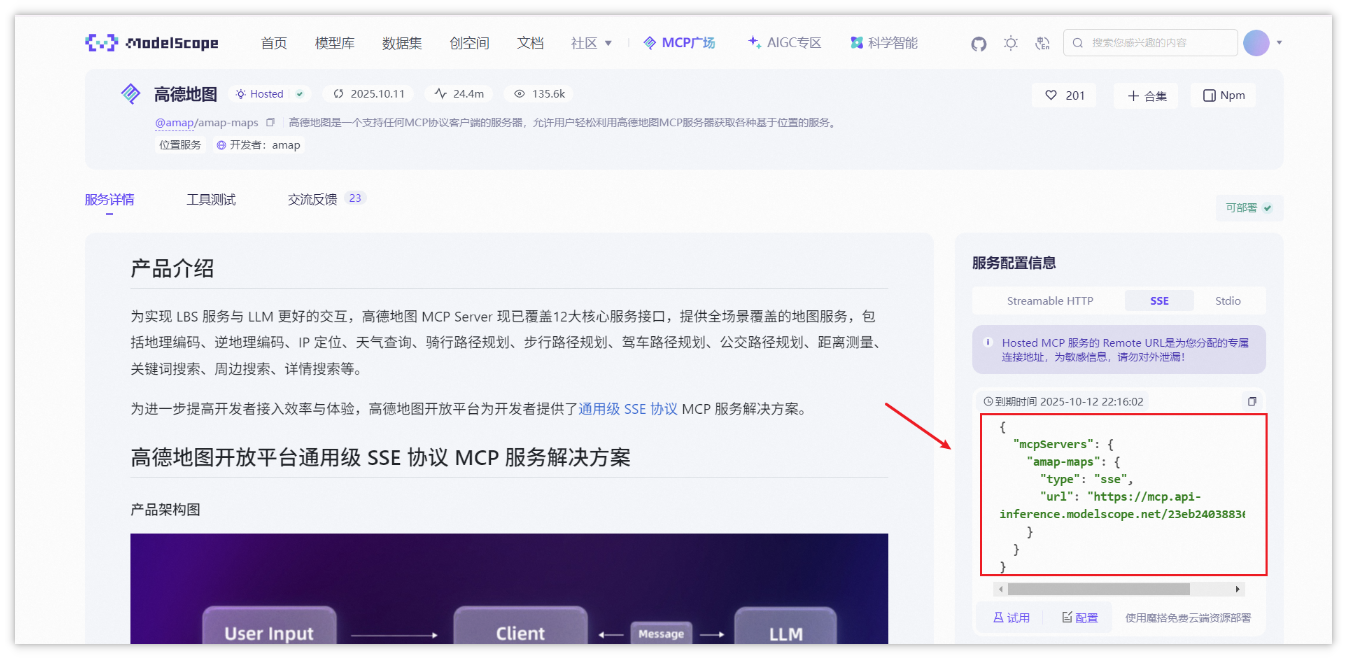 图中需要生成配置信息复制下来,可以进行测试或调用,打开MCP 实验场,可以测试我们开通的MCP 服务