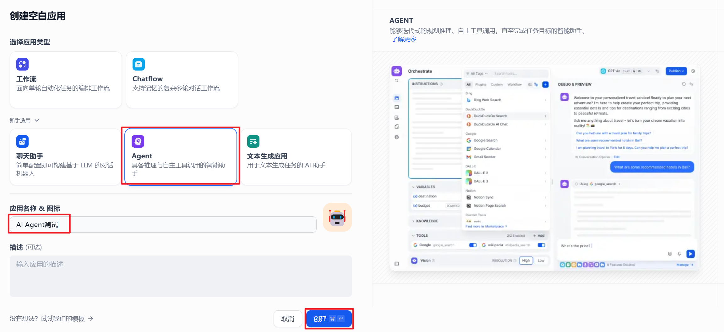 - 对话流:适用于定义等复杂流程的多轮对话场景,具有记忆功能的应用编排方式