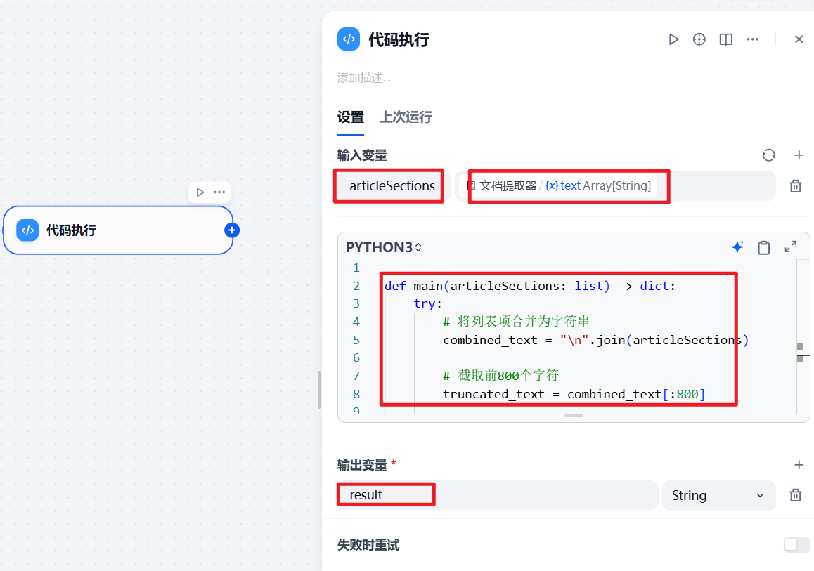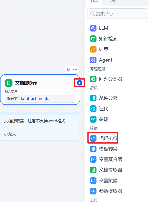 - 代码执行(Code):运行 Python / NodeJS 代码以在工作流程中执行数据转换等自定义逻辑。