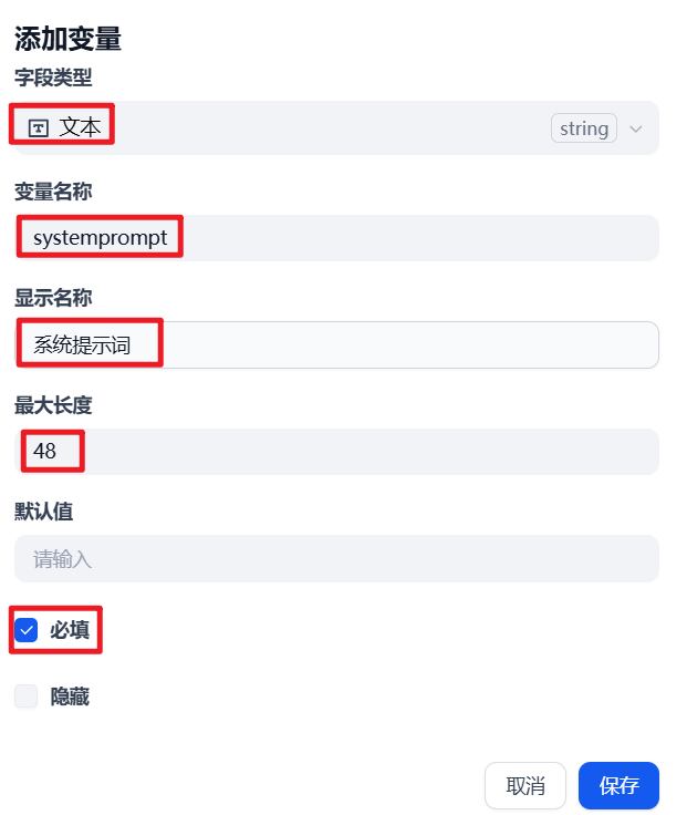 - systemprompt: 必填的系统提示词输入(48个字符限制)