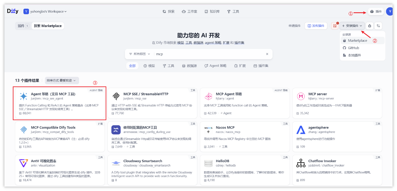打开 插件 ->安装插件 ->选择 Marketplace ->搜索 mcp ->安装 Agent 策略(支持MCP工具)