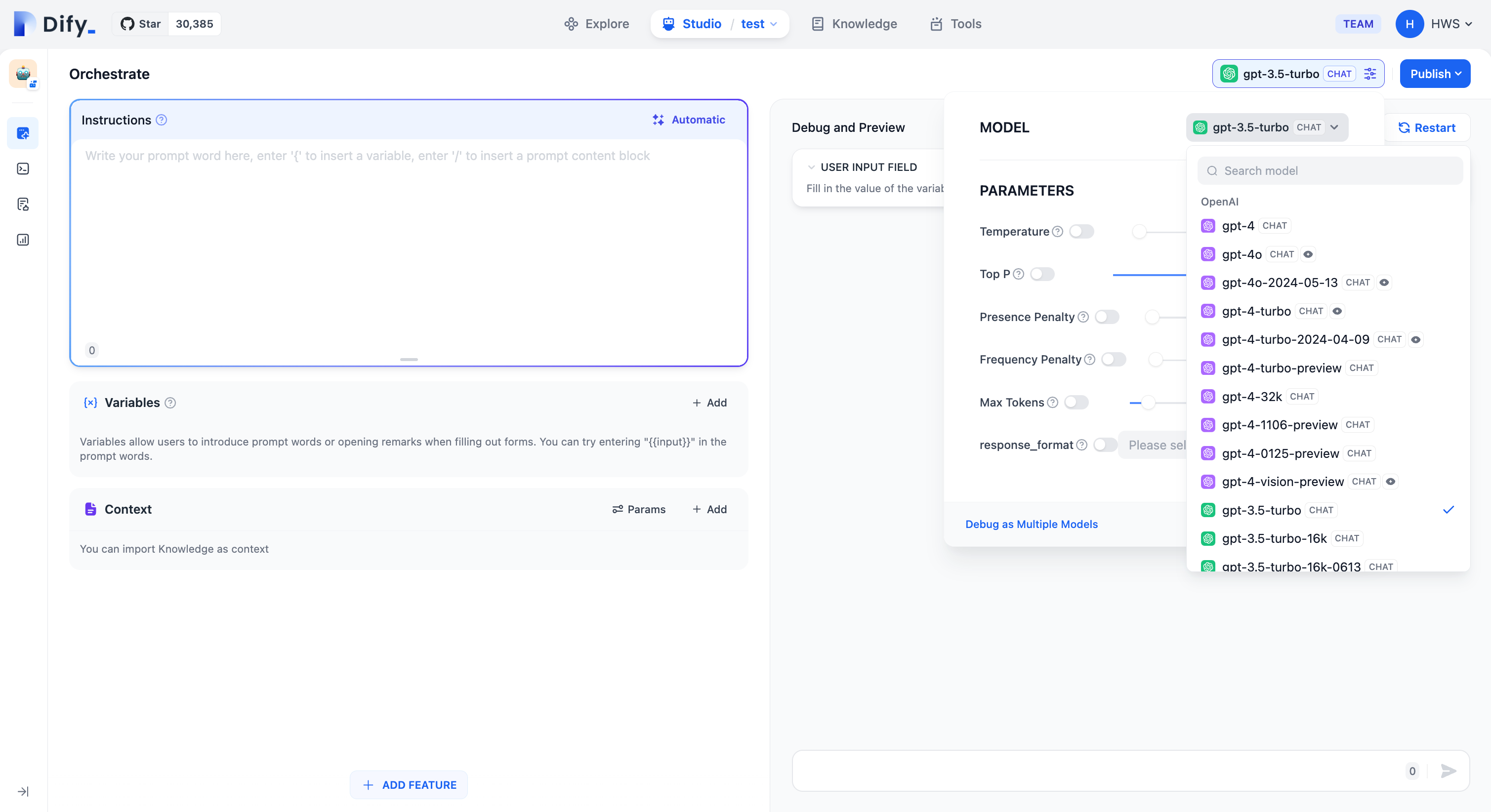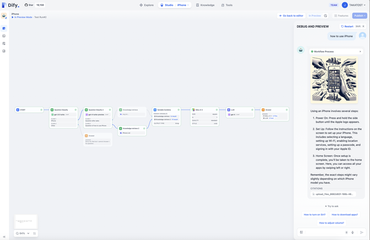 由于 Dify 内置了构建 LLM 应用所需的关键技术栈,包括对数百个模型的支持、直观的 Prompt 编排界面、高质量的 RAG 引擎、稳健的 Agent 框架、灵活的工作流,并同时提供了一套易用的界面和 API。这为开发者节省了许多重复造轮子的时间,使其可以专注在创新和业务需求上。