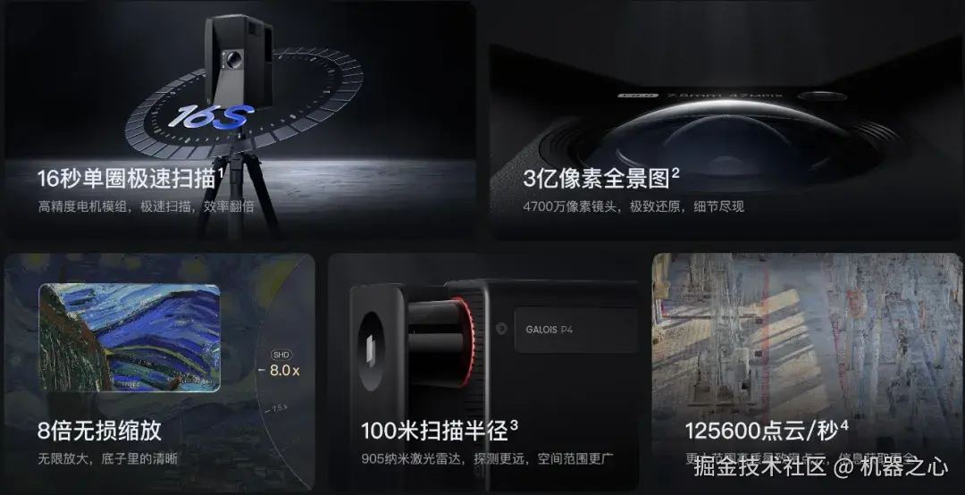 不同于业内一些只有图像数据(缺乏绝对尺度)或只有激光数据(缺乏纹理)的方案,如视通过自研的伽罗华(Galois)系列 3D 激光扫描仪(其 P4 型号可直出 3 亿像素超高清全景图,图像与点云平均匹配误差小于 2 个像素),确保了每一份数据都是「所见即所得」的高精度数据对。这种在源头就严格标定、高度一致的真实数据,是 Argus 1.0 能够学习到准确深度和绝对尺度的前提,也是其远超其他算法的养料。