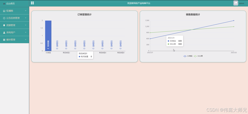 管理员通过账户和密码、滑动滑块验证完成后进行登录,如图5-10所示。管理员登录成功后进入到系统操作界面,可以对首页、轮播图、公告信息管理、新闻资讯、新闻分类列表、系统用户(管理员、注册用户、商家用户)模块管理(商品分类、商品中心、订单管理、销售数据)等功能模块进行相对应操作。如图5-11所示。