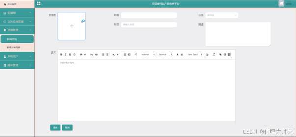 资源管理:管理员在资源管理页面看到新闻资讯+新闻分类列表两个子菜单,可对新闻资讯进行分类、添加、删除、修改等操作,如图5-12 5-13所示。