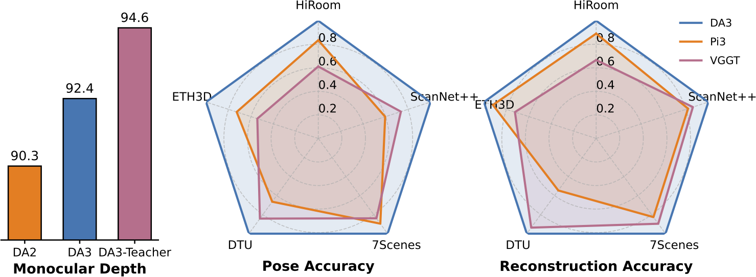 🏆 在单目深度估计中,DA3显著超越DA2;在多视角深度估计与姿态估计中,其表现优于VGGT模型。所有模型均仅基于公开学术数据集训练。